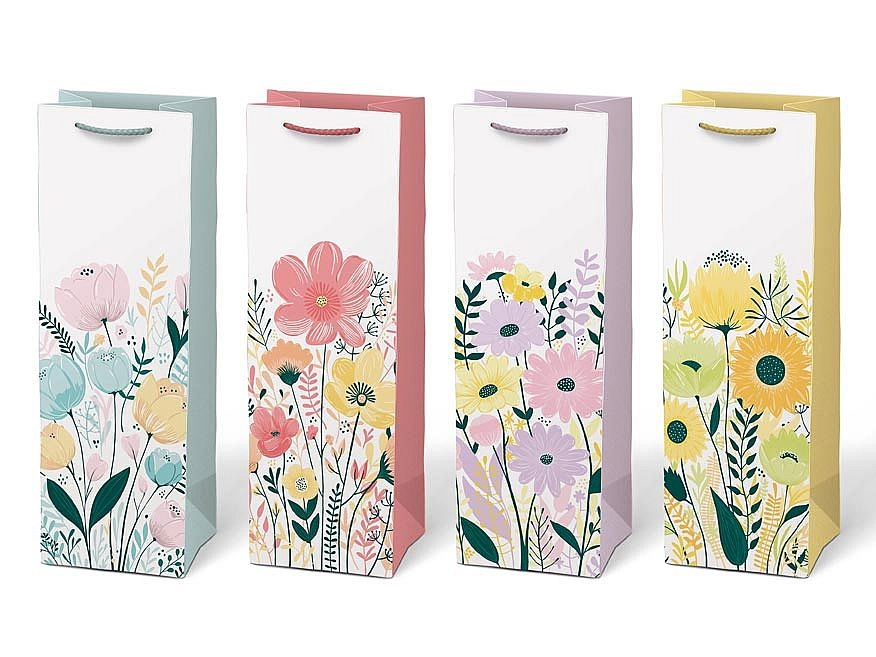 Des décorations florales pastel avec des anses solides et un bord renforcé, idéales pour offrir une bouteille avec élégance.