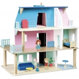 La maison séduit par sa finition colorée avec une façade rose et un toit bleu. Elle propose plusieurs étages, des balcons et est équipée de meubles et de décorations.