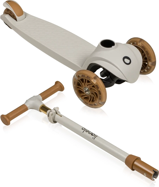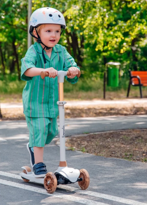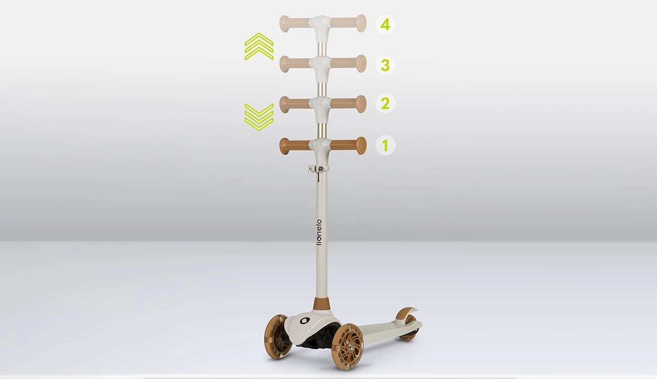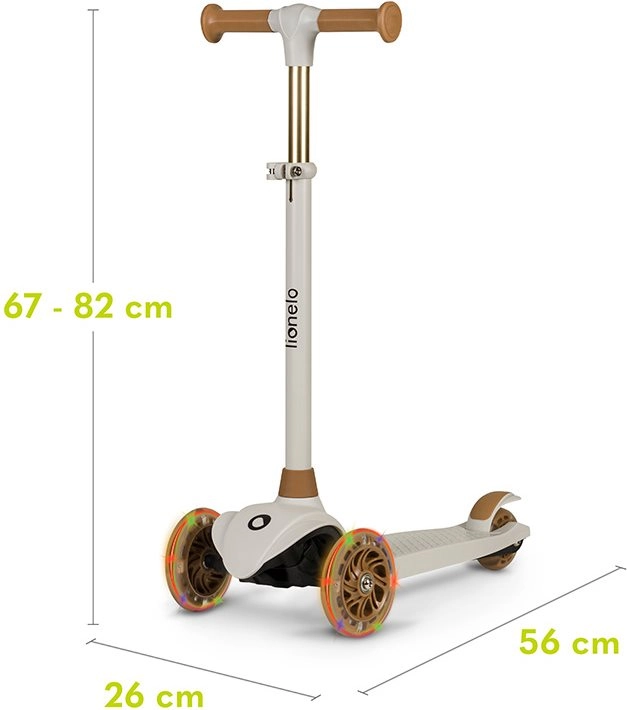 La LIONELO Jessy est la trottinette idéale pour les enfants qui apprennent à rouler et développent leur équilibre. La construction tricycle stable avec deux roues avant aide à gagner en confiance, tandis que le plateau bas et large avec surface antidérapante assure des montées et descentes en toute sécurité. Grâce aux roues LED qui s’allument en roulant, l’enfant est mieux visible et la conduite est encore plus amusante.