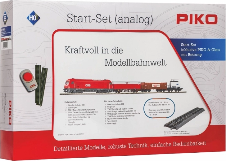 Coffret de modélisme complet de PIKO à l’échelle H0, contenant tout le nécessaire pour rouler immédiatement : locomotive diesel ÖBB Hercules, 3 wagons de marchandises, ovale de voies PIKO A-Gleis avec ballast intégré, alimentation et régulateur analogique. Grâce au montage facile, à la fiabilité de fonctionnement et à la possibilité d’extension et de numérisation (NEM 652), il est idéal pour débutants comme pour modélistes confirmés.