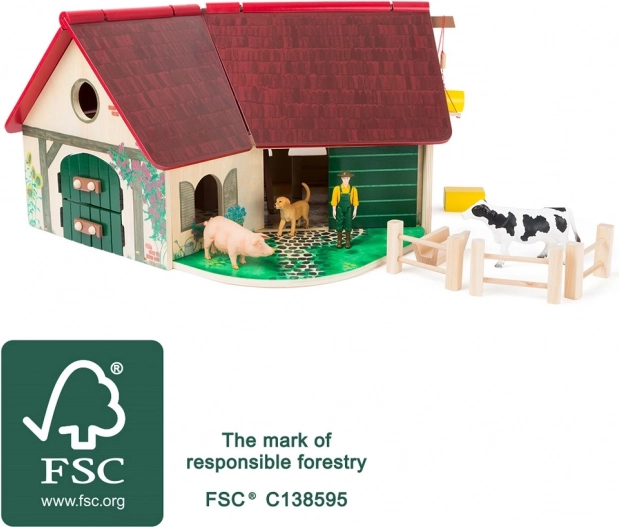 La ferme est fabriquée en bois 100 % certifié FSC, écologique et sûr pour les enfants. Ce bois provient de forêts gérées de manière à protéger notre planète.