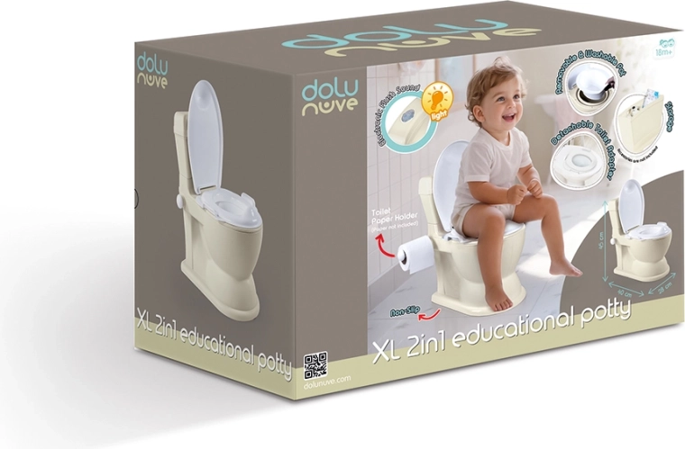 Une toilette pour enfant XL réaliste de couleur beige facilite l'apprentissage de la propreté. Elle offre des effets lumineux et sonores de chasse d'eau, un porte-papier toilette, une base antidérapante pour la sécurité et un espace de rangement dans le réservoir de chasse. Grâce à la cuve intérieure amovible, le nettoyage est rapide et hygiénique, et le siège amovible peut être utilisé comme réducteur sur des WC classiques.