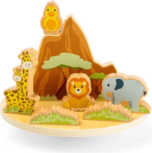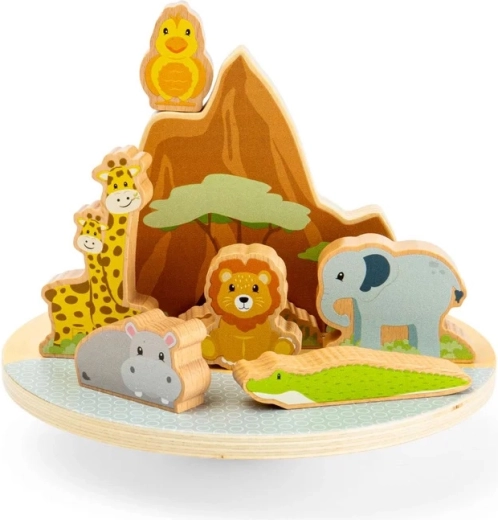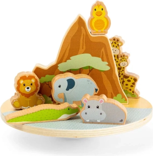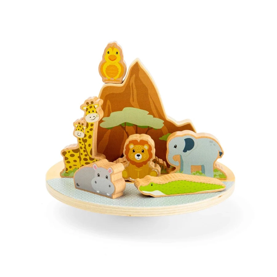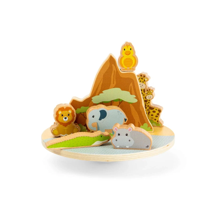 Le jeu d’équilibre jungle offre à la fois amusement et apprentissage. Sur une base délicatement basculante, les enfants cherchent le juste équilibre pour le lion, l’éléphant, les girafes, l’hippopotame, le crocodile et l’oiseau. Les figurines colorées et massives tiennent parfaitement dans les petites mains et encouragent le récit créatif et la pensée logique.