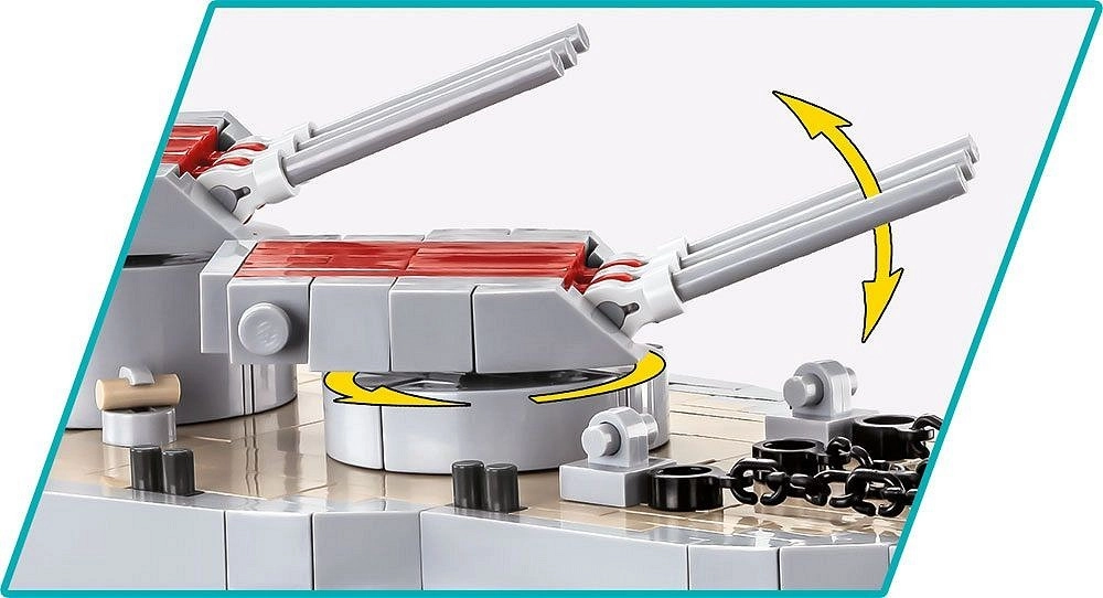 Le modèle offre de nombreux détails fonctionnels pour une exposition attrayante comme pour le jeu : tourelles d’artillerie rotatives, élévation des canons réglable, hélices et gouvernails mobiles, ainsi qu’un socle d’exposition élégant avec plaque nominative. Des pièces de haute qualité imprimées garantissent la tenue des couleurs et des formes.