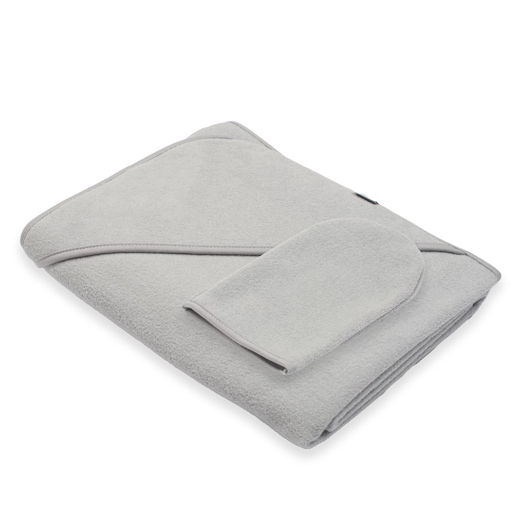 Une serviette bébé en éponge à capuche NEW BABY de couleur grise, douce et très absorbante, qui offre un soin délicat après le bain pour les bébés comme pour les enfants plus grands. La capuche pratique garde la tête au chaud, la serviette absorbe parfaitement l’humidité et sèche rapidement. Une gant de toilette en éponge offert est inclus dans l’emballage.