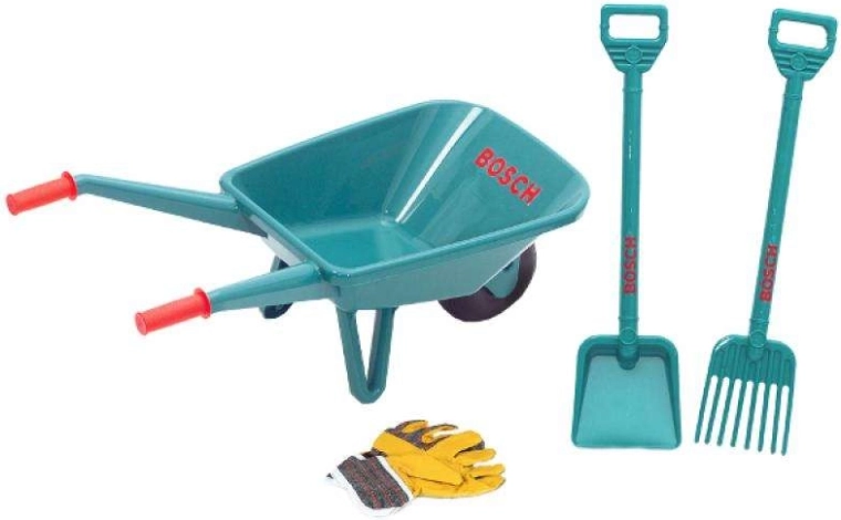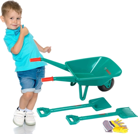 Découvrez l’amusant set de jardinage pour enfants sous licence BOSCH de la marque Klein : une brouette légère en plastique, une pelle, un râteau et des gants pour jouer au jardin en toute sécurité. Idéal pour transporter du sable, des feuilles et développer motricité et imagination.