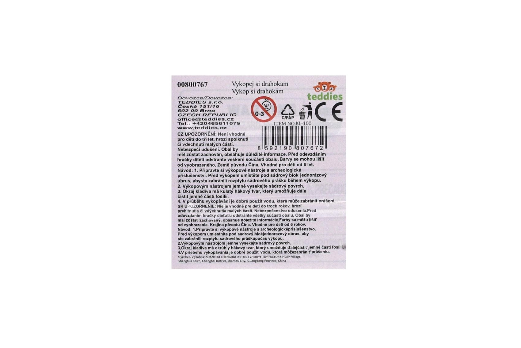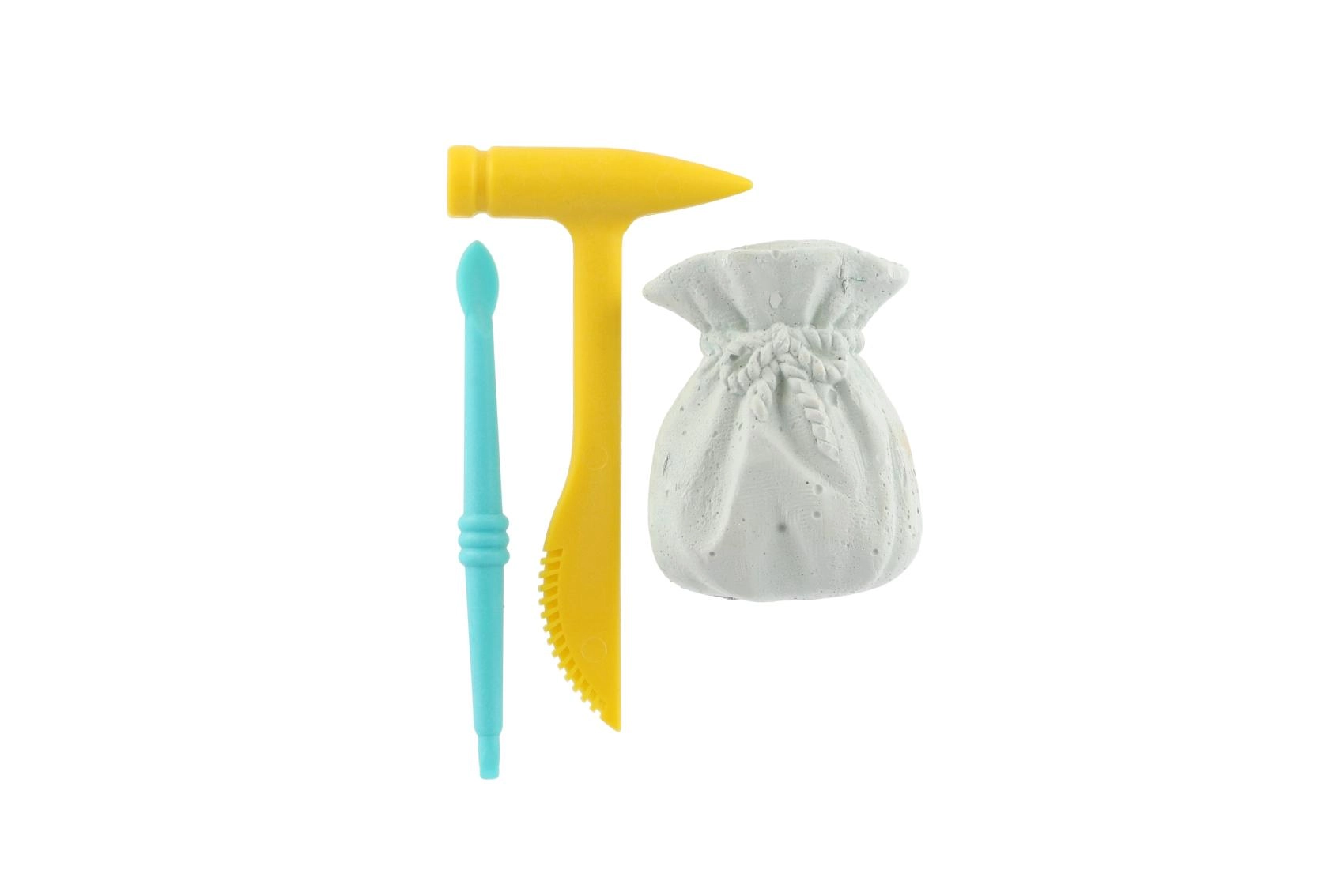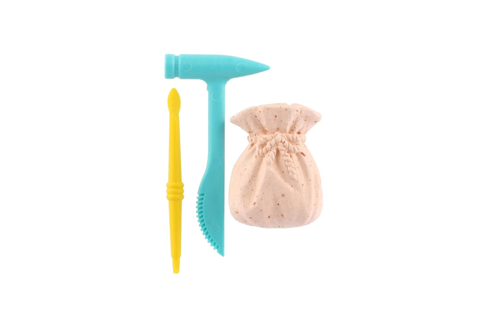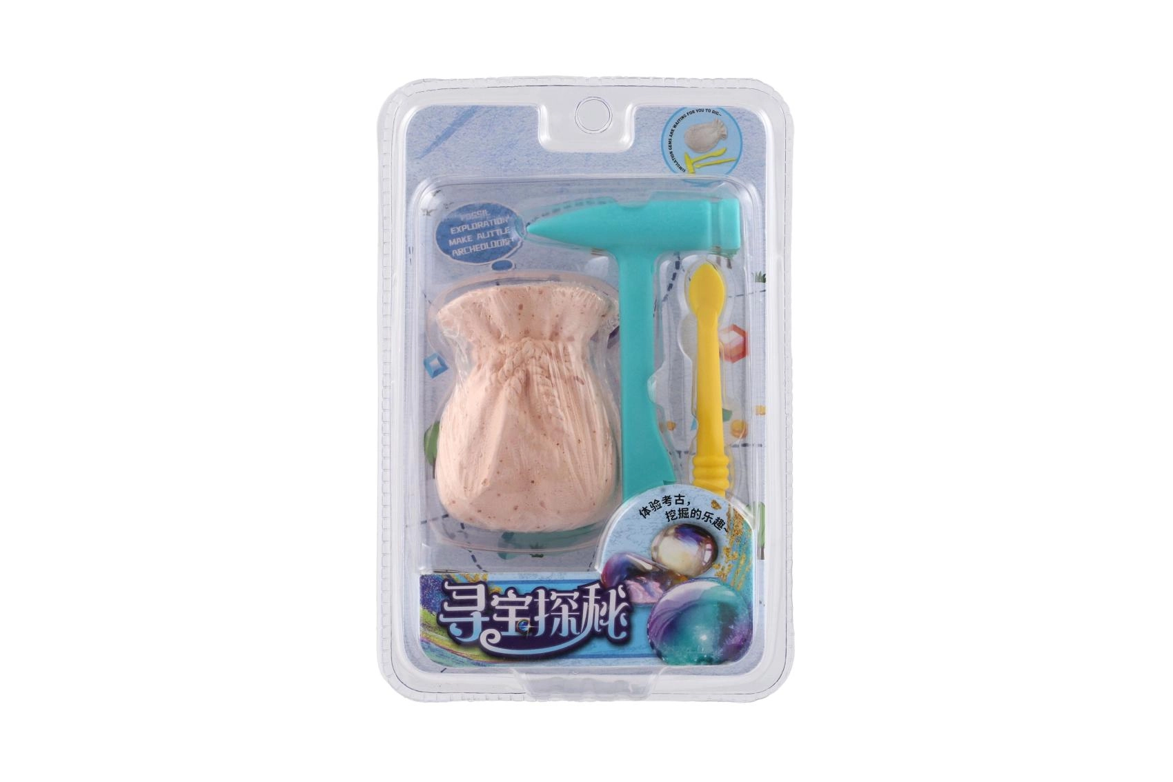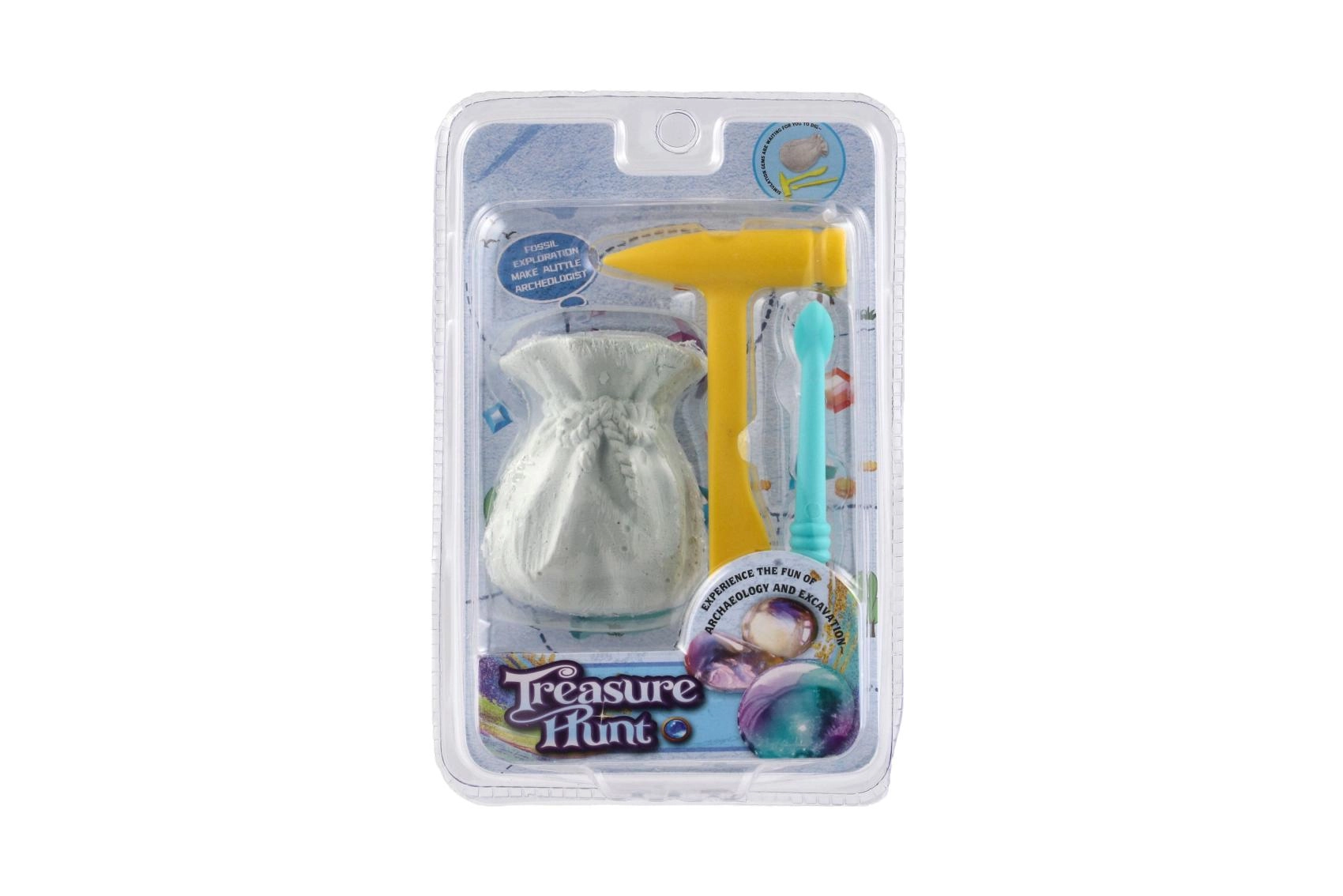 Le blister compact contient un petit marteau, un burin/pinceau et un bloc en forme de bourse avec une pierre cachée – prêt à être excavé dès l’ouverture.