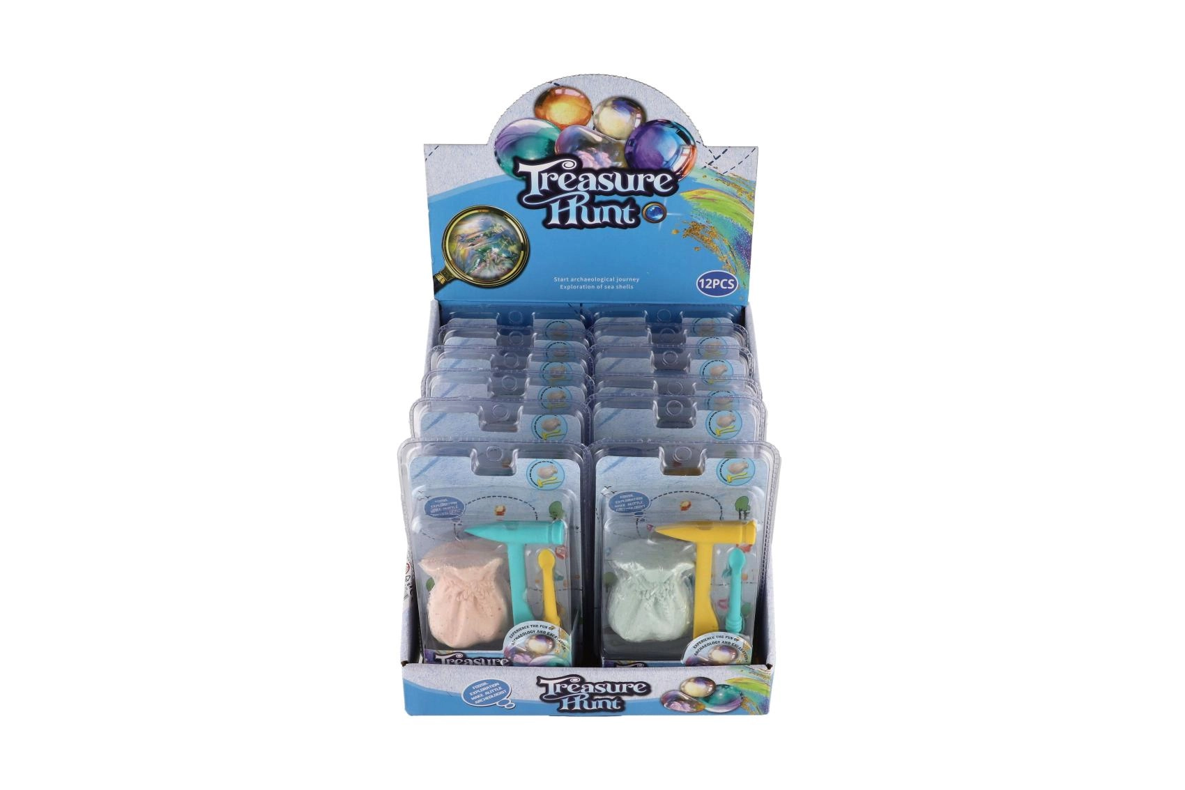 Chaque blister contient un mini kit individuel, idéal comme cadeau original, récompense ou ajout aux pochettes-surprises des fêtes d’enfants. La présentation en présentoir de comptoir de 12 pièces facilite la vente et le stockage. Grâce aux deux variantes de couleur des outils et des blocs, chaque excavation est différente et palpitante.