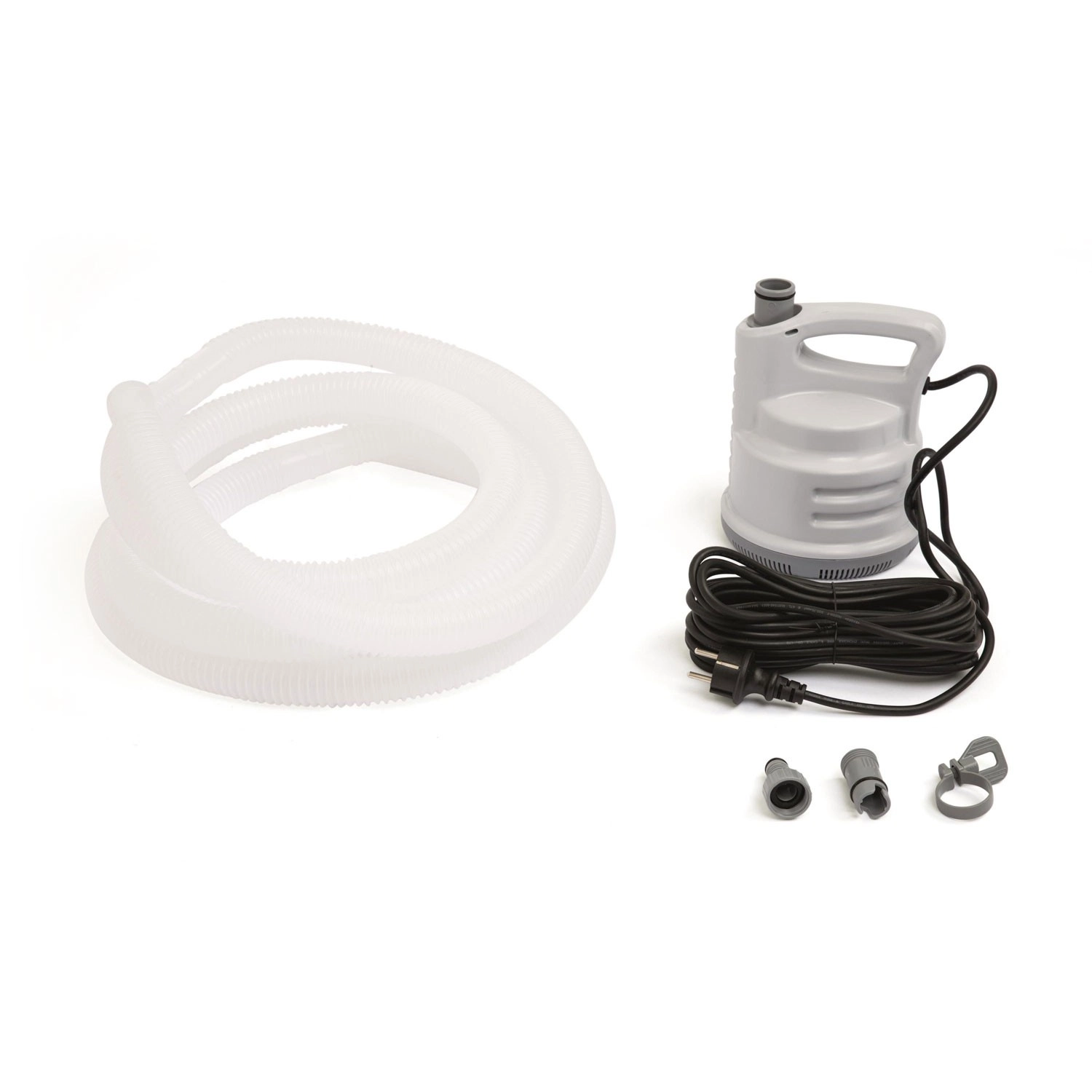 L’emballage contient tout le nécessaire pour une utilisation immédiate – tuyau d’évacuation de 5 m, adaptateurs pour tuyau d’arrosage et pince pour un raccordement sécurisé. Alimentée en 220–240 V et d’une puissance de 80 W, la pompe est économe en énergie tout en restant suffisamment performante pour une vidange rapide de l’eau de piscine.