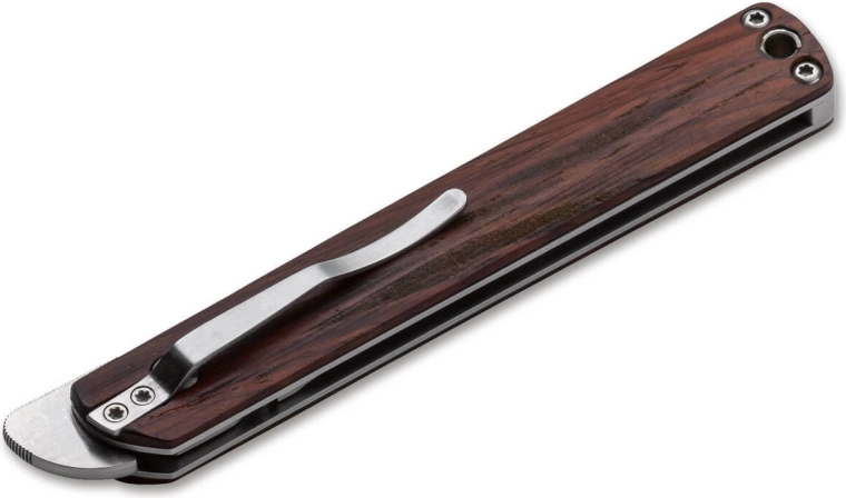 La lame en acier inoxydable 440C au tranchant lisse fonctionne sur des roulements à billes, assurant une ouverture fluide et rapide à l’aide du front flipper. Le système de maintien de type slipjoint avec crantage offre une action sûre et raffinée au travail. Le manche ergonomique en bois de cocobolo à finition satinée tient agréablement en main et, grâce aux intercalaires en acier inoxydable, procure une impression de solidité et de stabilité.