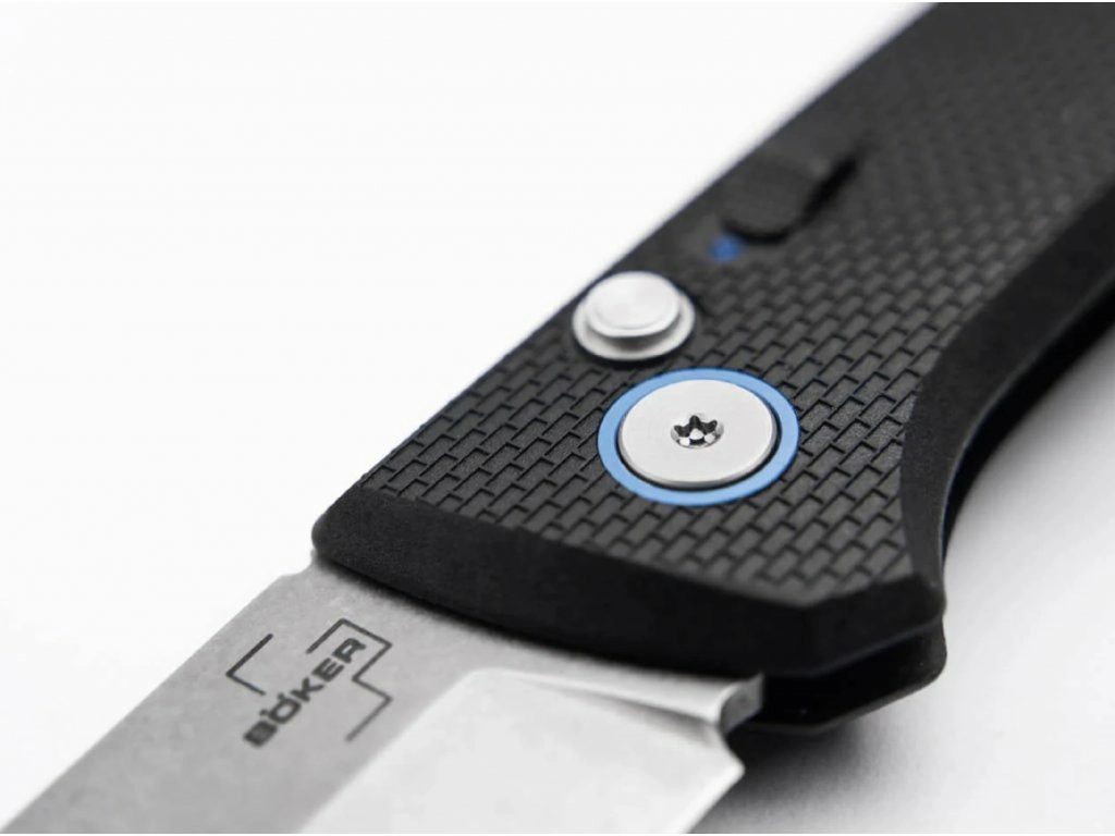 La poignée en Grivory, matériau léger et durable, avec surface texturée, tient fermement en main. L’ouverture automatique par pression sur le bouton est rapide et fluide, tandis que la double sécurité minimise le risque d’ouverture involontaire. Les détails anodisés bleus confèrent un aspect premium, et le clip fil permet un port discret en poche.