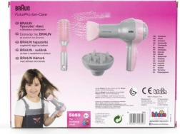 Nous vous présentons le sèche-cheveux pour enfants Braun avec diffuseur et brosse idéal pour les petites coiffeuses. Ce produit est fabriqué sous licence de la société Braun, ce qui lui confère un aspect réaliste, semblable à un véritable appareil. Le produit est totalement sûr, le sèche-cheveux souffle uniquement de l'air sans chauffer, garantissant ainsi la sécurité des mains des enfants.