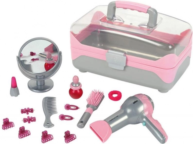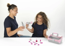 Cette collection d'articles de coiffure de l'entreprise Klein est principalement destinée aux filles. Elle offre une large gamme de produits qui se complètent à merveille. Grâce au jeu, les enfants peuvent imiter des situations du monde adulte. Les appareils de coiffure comme le sèche-cheveux ou le fer à lisser imitent le fonctionnement des vrais appareils et sont conçus avec un soin exceptionnel, permettant aux filles de créer des coiffures non seulement pour leurs poupées, mais aussi pour leurs mamans ou leurs amies. Le sèche-cheveux souffle de l'air, mais ne chauffe pas. Le peigne, la brosse et les pinces ont des bouts arrondis pour un jeu en toute sécurité.