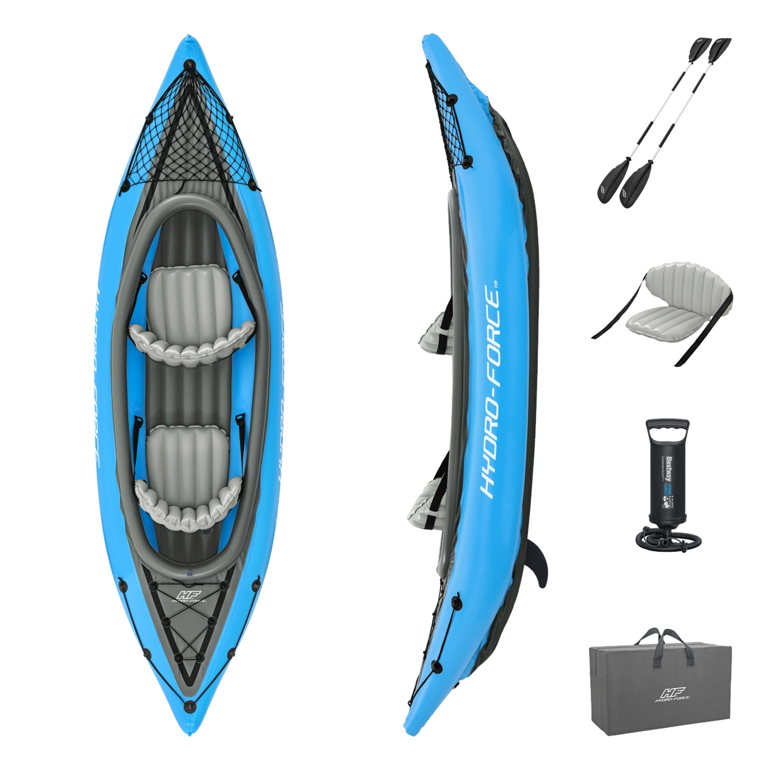 - Kit complet prêt pour l’eau : kayak, 2 pagaies, pompe, dérive, rustine, sac