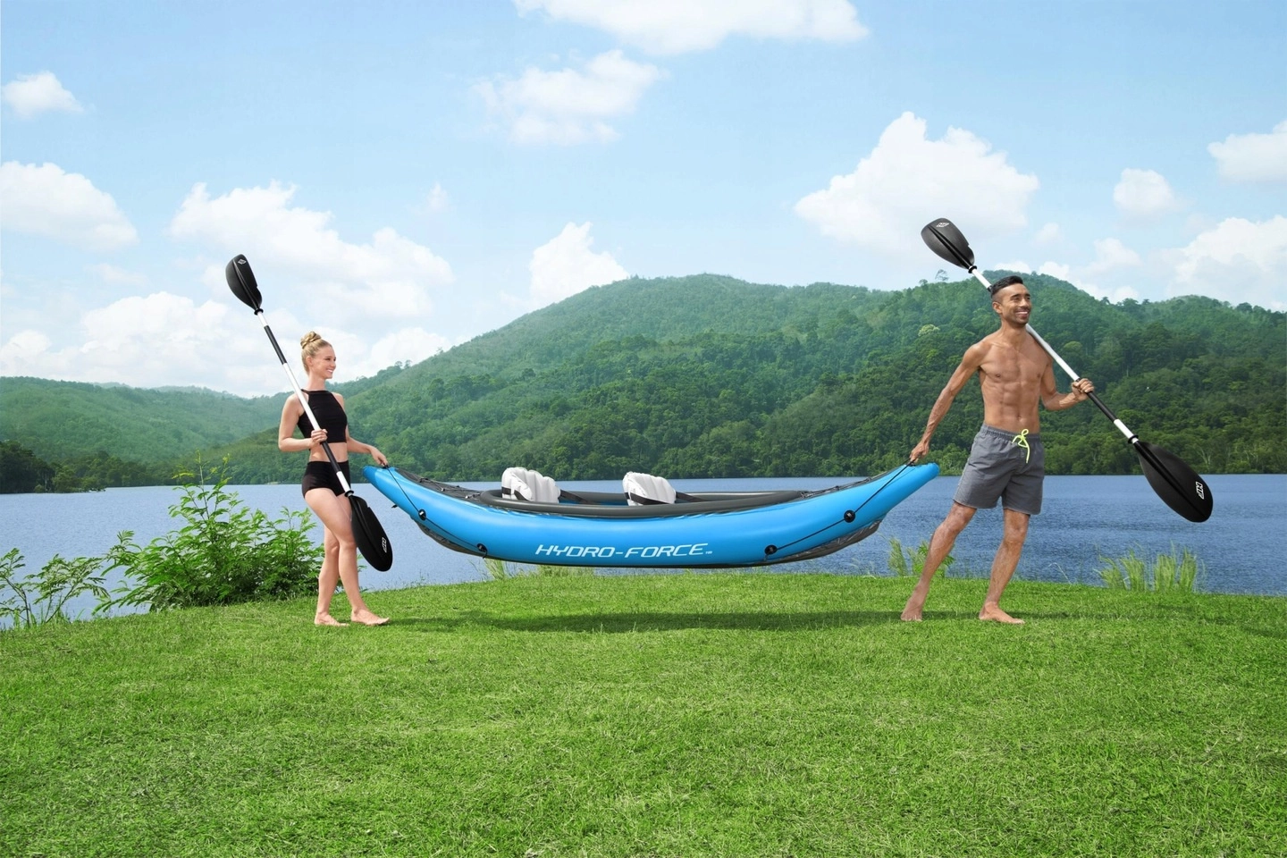 Le pack comprend un kayak pour 2 personnes, deux pagaies double pale, une pompe manuelle Air Hammer, une dérive/skeg amovible, une rustine de réparation et un sac de transport – partez immédiatement.