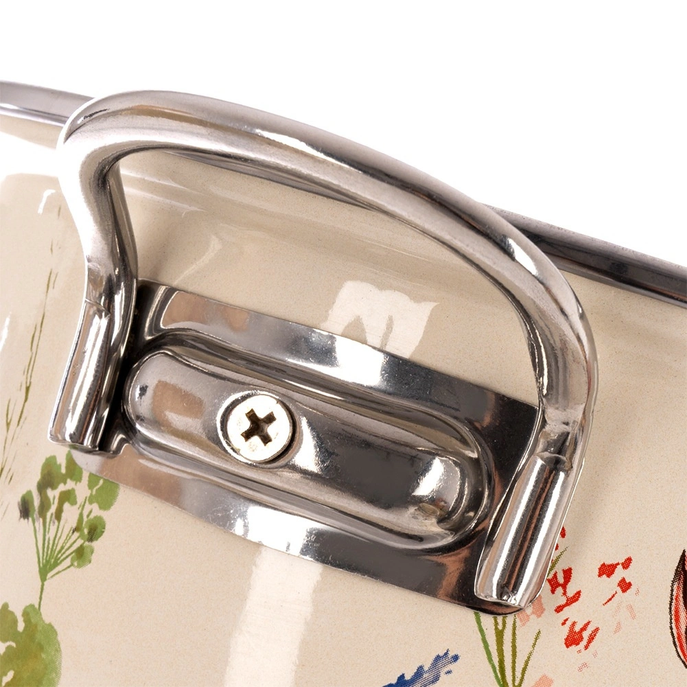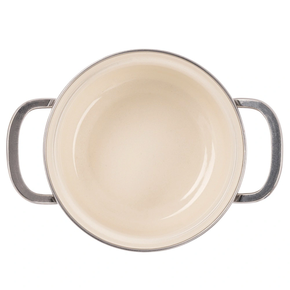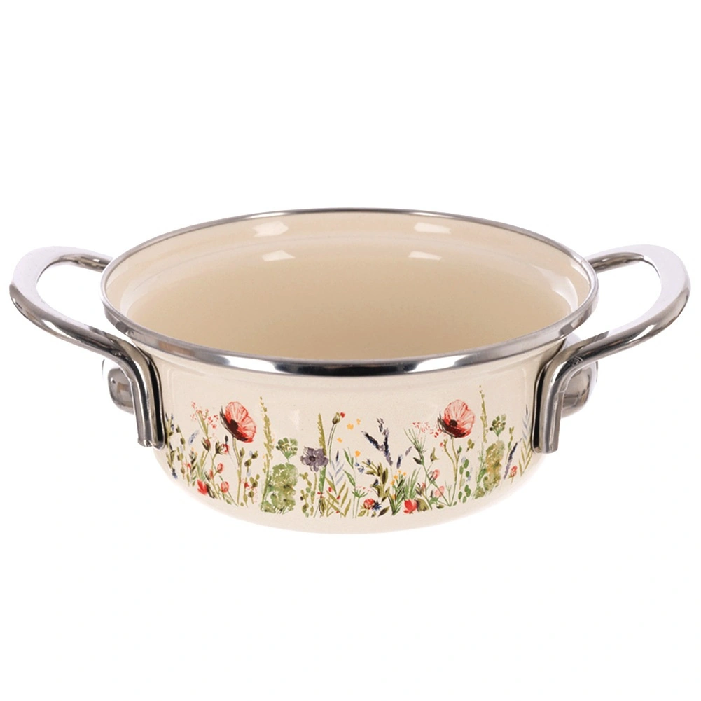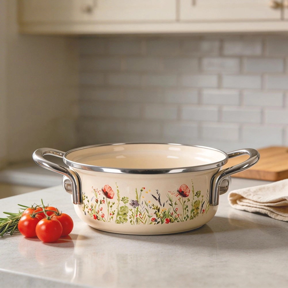 Cette casserole au design rétro séduit par sa finition crème, son décor floral et sa construction robuste. Grâce à son format compact (diamètre 14 cm, hauteur 6 cm, volume 600 ml, longueur avec anses 20 cm), elle est parfaite pour sauces, soupes, purées ou pour étuver des accompagnements. La surface émaillée est hygiénique, résistante et adaptée aux personnes allergiques.