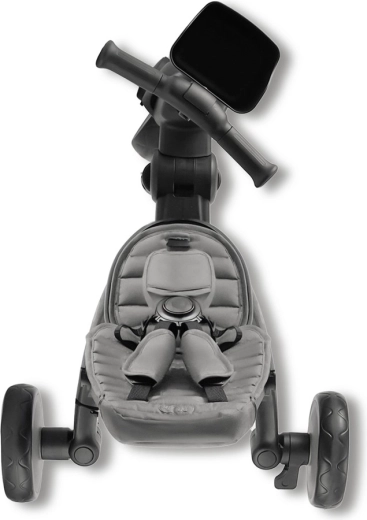 Des ceintures à 3 points réglables, une barre de sécurité amovible et un frein arrière maintiennent le petit pilote en sécurité, tandis que l’assise moelleuse et la capote garantissent le confort.