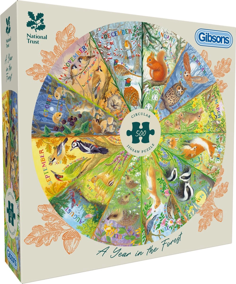 Appréciez une illustration saisissante des transformations de la forêt au fil des quatre saisons dans un format rond original. Le puzzle GIBSONS Une année en forêt offre une difficulté équilibrée grâce à 500 pièces fabriquées avec précision et constitue un excellent choix pour se détendre tout en entraînant sa concentration.