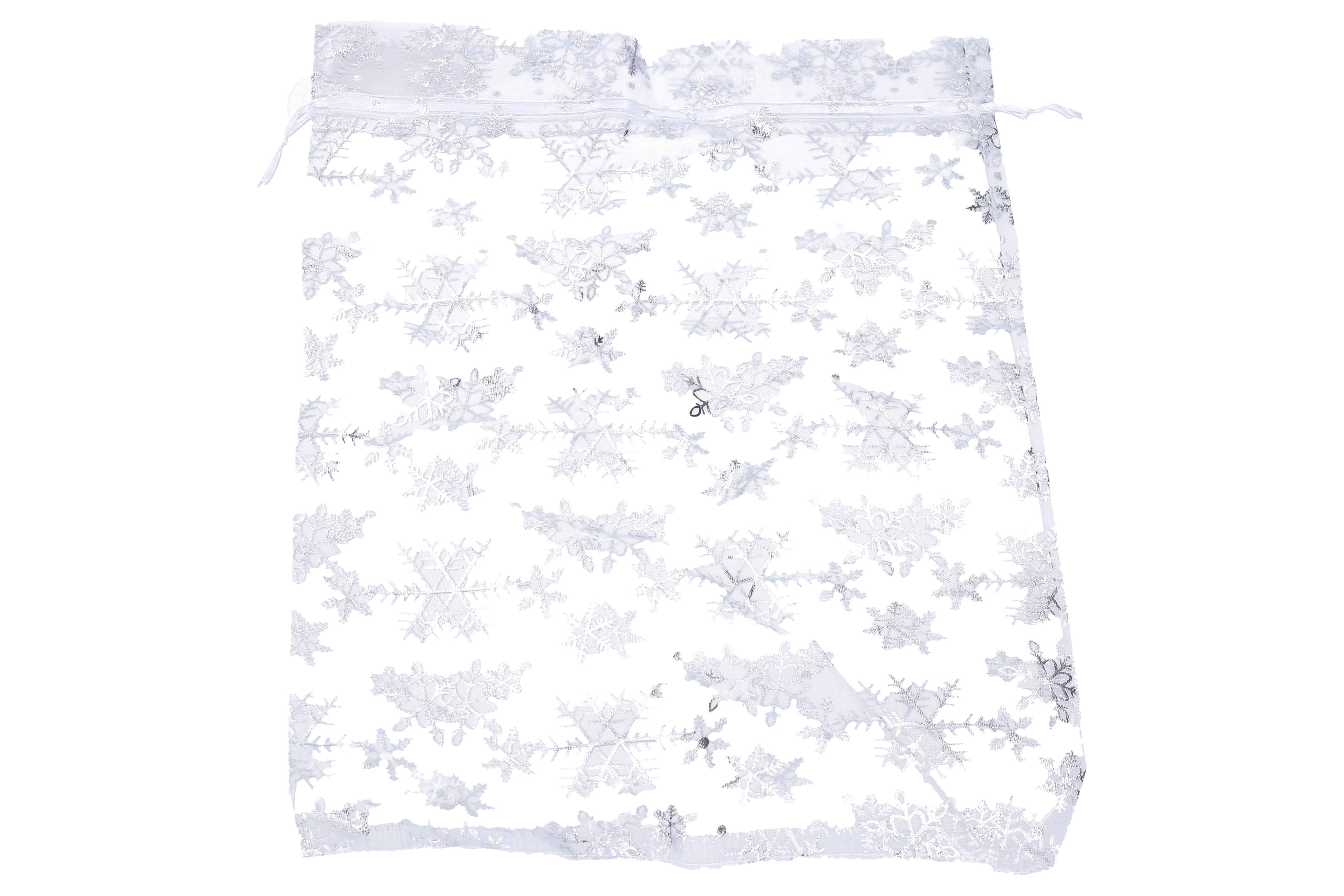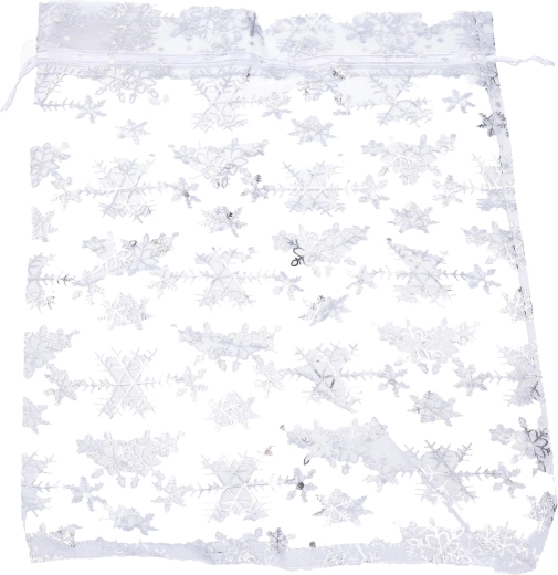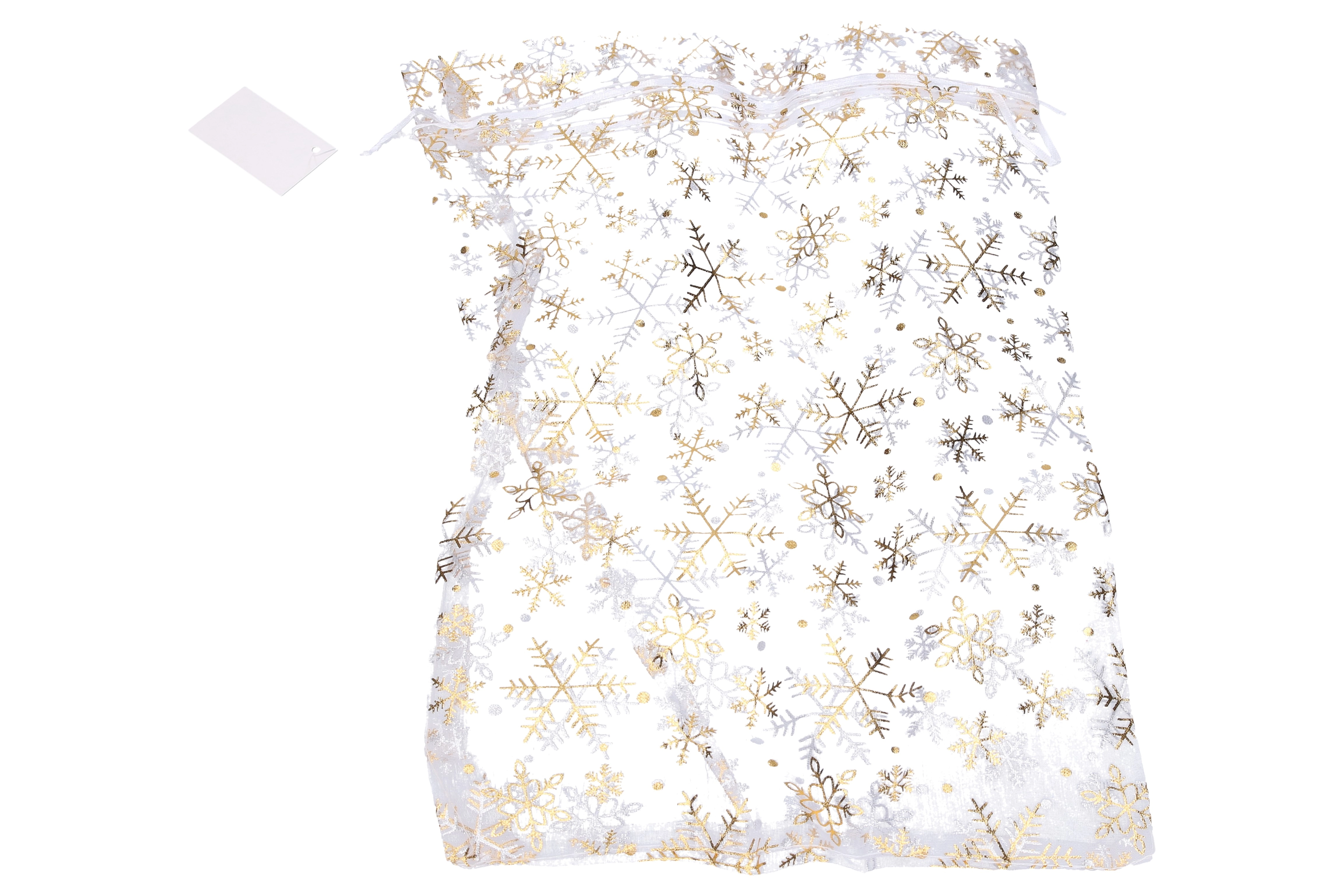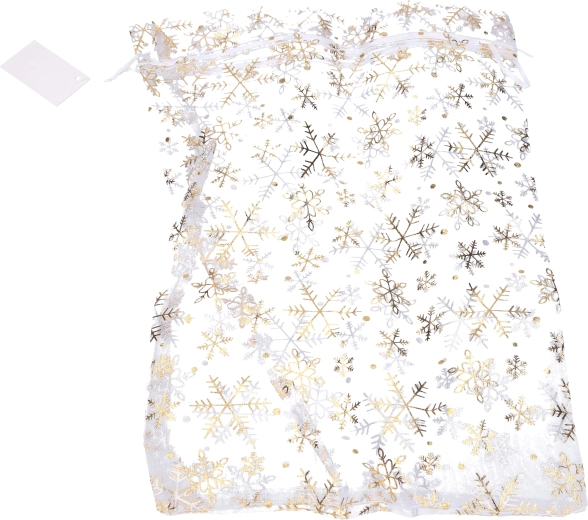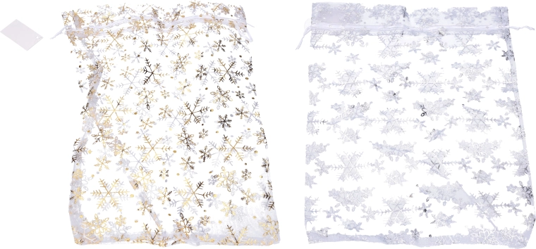 Élégante pochette en organza avec motif de flocons de neige, format 17 × 23 cm, idéale pour un emballage rapide et stylé de petits cadeaux, cosmétiques ou décorations. Le matériau semi-transparent avec impression métallisée crée une atmosphère festive et confère à chaque paquet un look luxueux. Disponible en versions dorée et argentée avec cordon de serrage pour une fermeture facile.