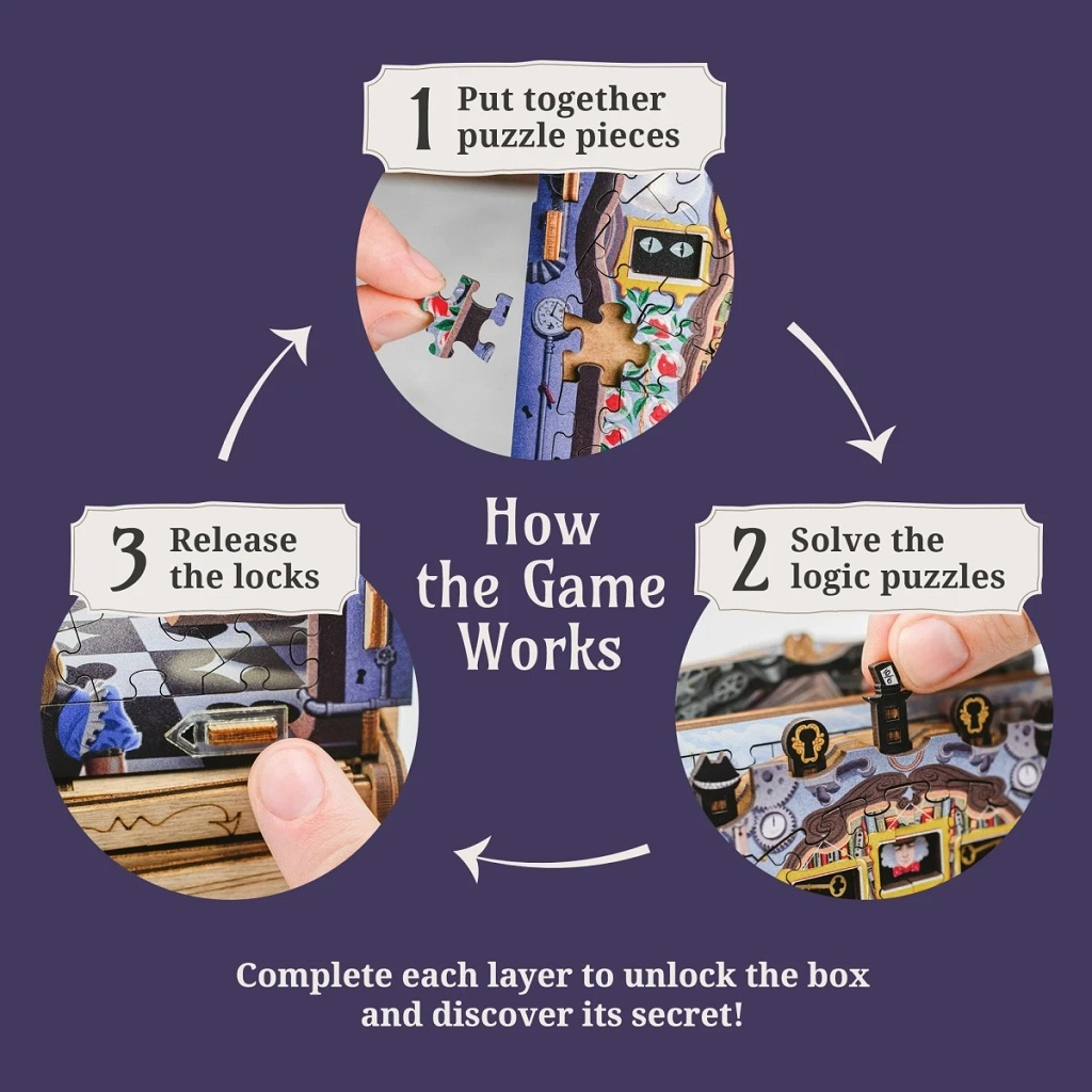 Un concept original qui associe l’assemblage de scènes illustrées à des indices cachés et à une mécanique de jeu d’évasion. Chaque étape vous rapproche du déverrouillage de la boîte mystérieuse.