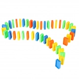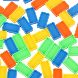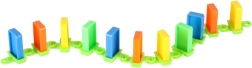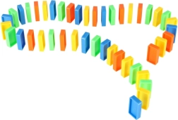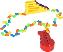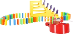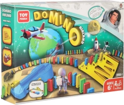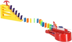 Contenu de la boîte : 126× pièces de domino (4 couleurs), 2× avions avec lanceur, éléments de piste, 2× billes, 1× figurine, 12× socles pour dominos, 52× autocollants éducatifs (lettres, chiffres, signes mathématiques).