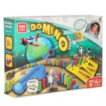 126 dominos, 2 avions avec lanceur, éléments de piste, 2 billes, figurine, 12 socles, 52 autocollants éducatifs