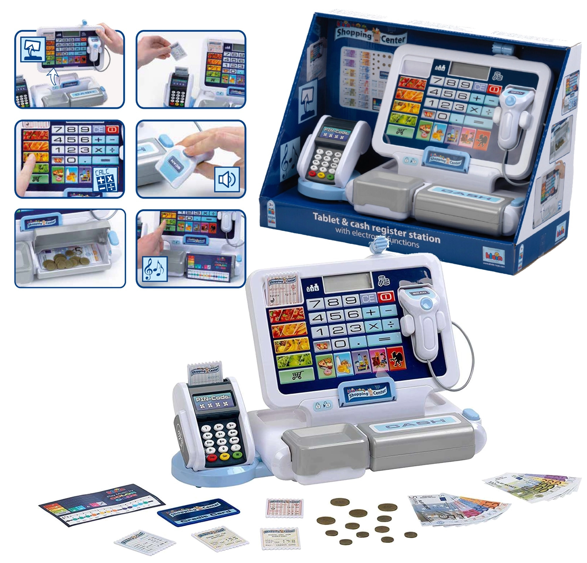 La caisse électronique pour enfants imite une vraie caisse : elle dispose d’un écran clair avec calculatrice, d’un lecteur de cartes, d’un scanner et d’un tiroir-caisse rabattable avec le célèbre « clic ». Les enfants peuvent « scanner » les articles, saisir les prix et laisser la caisse additionner automatiquement. Le design gris et blanc est moderne et épuré.