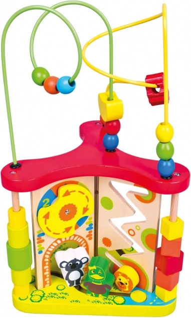 Ce labyrinthe d’activités multifonction en bois de la marque Bino est conçu pour divertir tout en développant les enfants. Les perles sur des fils métalliques, les éléments rotatifs et coulissants ainsi que les motifs d’animaux illustrés stimulent la curiosité, la concentration et la coordination œil–main.