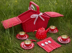 Ce charmant panier de pique-nique aux motifs à pois et petits cœurs renferme un service à thé en métal prêt pour chaque goûter imaginaire. La conception robuste avec sangles velcro réglables et bord textile garantit un transport et un rangement faciles de toutes les pièces. Les enfants développent leur interaction sociale, leur motricité et leur créativité.