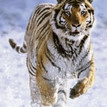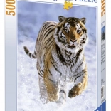 Le puzzle présente une magnifique image d'un tigre en mouvement dans la neige, captivant par ses couleurs contrastées.