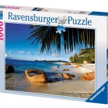 Le puzzle représente un magnifique paysage tropical avec des palmiers, du sable et des rochers sur une côte paradisiaque.