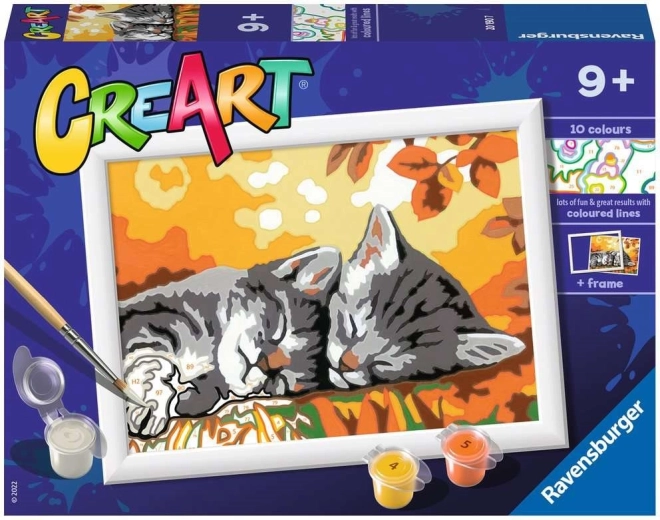 CreArt de la marque RAVENSBURGER apporte un divertissement créatif pour enfants et adultes. Il suffit de remplir les zones numérotées avec les couleurs correspondantes et de voir apparaître devant vous une peinture à l’aspect professionnel représentant d’adorables chatons dans des teintes automnales. Un cadeau idéal pour ceux qui souhaitent débuter la peinture sans préparatifs compliqués.
