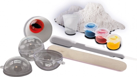 Contenu du coffret : 2 poudres pour fabriquer des yeux, 3 colorants, un gobelet doseur, 2 spatules, 3 pipettes, 4 moules, 2 yeux, 3 sachets refermables, un manuel.