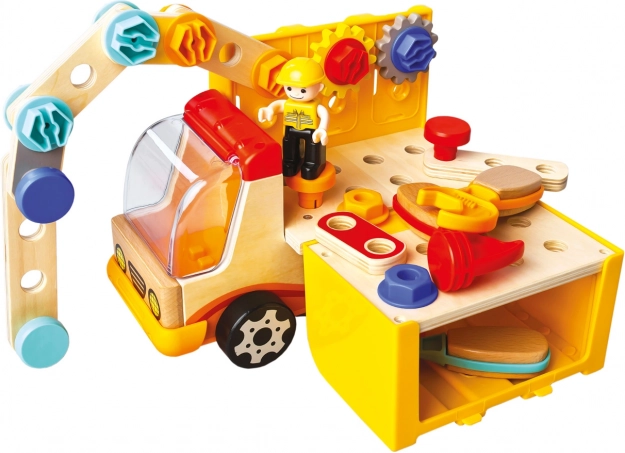 BINO camion de chantier multifonction avec outils et 30 pièces. Résistant, léger, avec figurine de conducteur. Développe la motricité fine et l’imagination des enfants dès 3 ans.