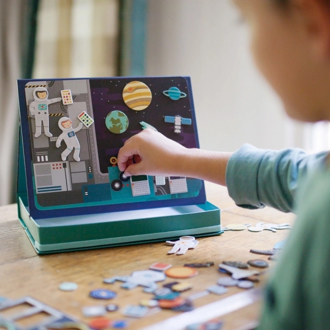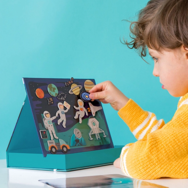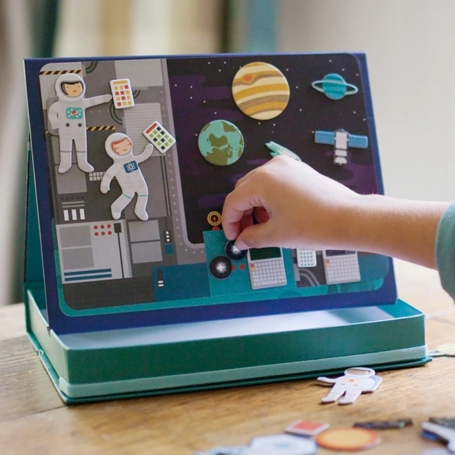 Le théâtre magnétique de l’espace propose d’infinies combinaisons et scènes sur deux fonds magnétiques – dans l’espace et dans la station spatiale. Grâce à plus de 50 pièces magnétiques, les petits explorateurs peuvent créer des histoires originales, développer leur imagination et leur motricité fine. La boîte pratique avec support et butées permet d’installer facilement la scène partout.