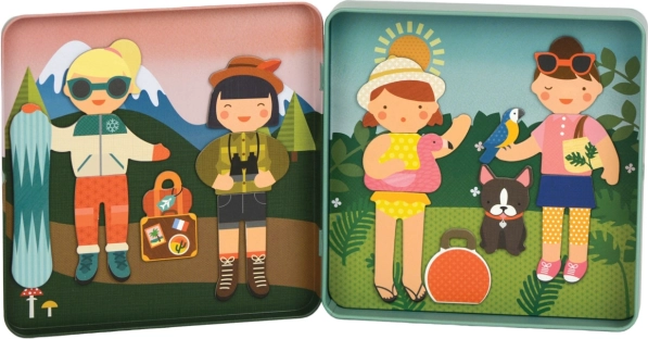Un livre magnétique de poche amusant pour les petits voyageurs. Grâce à plus de 25 aimants, les enfants peuvent mixer les pièces et créer des personnages, découvrir deux scènes à l’intérieur et développer l’imagination et la motricité fine. La boîte en métal se ferme solidement, idéale pour les voyages.