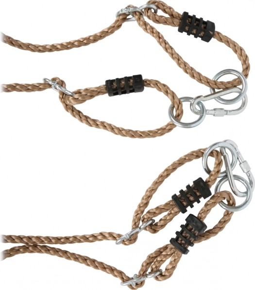 Les cordes en nylon avec œillets métalliques, anneaux et mousquetons de sécurité assurent une suspension rapide, solide et sûre.