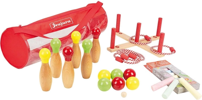 Ensemble de jeux extérieurs Jeujura est idéal pour chaque aire de jeux pour enfants. Dans ce kit pratique, vous trouverez tout le nécessaire pour des jeux amusants comme la marelle ou le bowling. Tout est fabriqué à partir de bois de haute qualité et de peintures à base d'eau garantissant sécurité et durabilité.