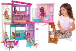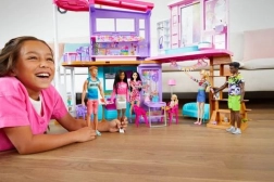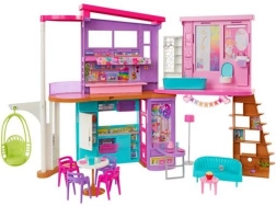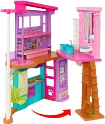 La maison de vacances dispose de deux niveaux et de six zones de jeu telles qu'une chambre, une salle de bain et un salon. Elle offre un design moderne de Barbie.