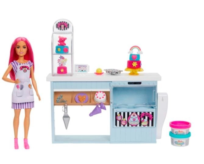 Le set BARBIE pâtisserie transforme la chambre en une boulangerie parfumée. La station à trois zones (cuisson – décoration – exposition) stimule la créativité et le jeu de rôle. Deux couleurs de pâte à modeler permettent aux enfants de créer des gâteaux et des biscuits qui « montent » en tirant le levier du four, puis se décorent sur le socle.