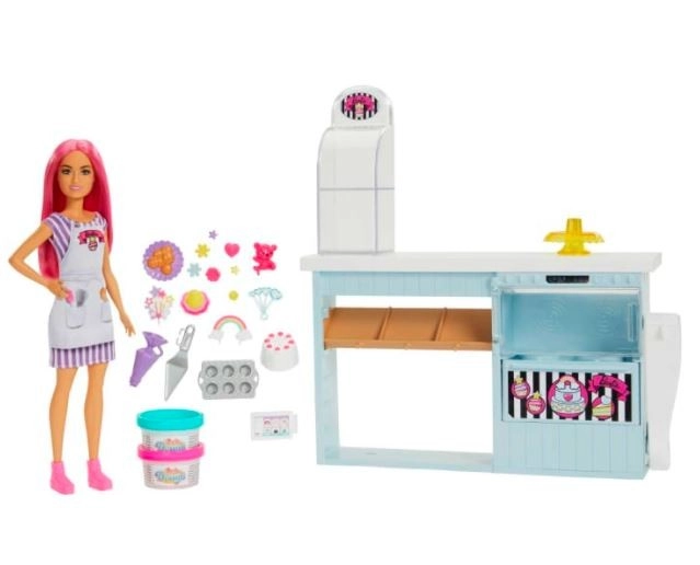 Découvrez la joie de la pâtisserie avec le coffret de jeu BARBIE pâtisserie. Les enfants peuvent cuire, décorer et exposer des gâteaux et des biscuits grâce à plus de 20 accessoires et à une station de boulangerie réaliste. Le set comprend une poupée BARBIE boulangère de petite taille aux cheveux roses, des moules et des pâtes à modeler rose et bleue. Il suffit de placer la pâte dans le « four », de tirer le levier et de regarder le gâteau monter, puis de le décorer sur le présentoir avec les accessoires. Un excellent cadeau pour les enfants dès 3 ans.