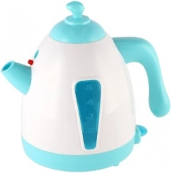 La théière est conçue comme un véritable appareil de cuisine avec un mélange de couleurs blanc et turquoise élégant.