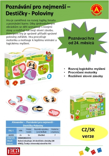 Ce jeu simple et malin d’ALEXANDER est conçu pour les plus jeunes explorateurs. Les enfants associent les bonnes moitiés d’animaux et entraînent ainsi leur logique, le toucher et la perception des couleurs. Grâce aux images simplifiées, ils découvrent de nouveaux mots et développent leur vocabulaire en douceur.