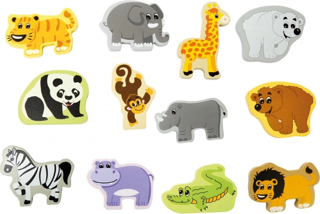 - 12 figurines en bois d’animaux exotiques + valisette (au total 13 pièces)