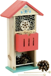 Vilac Hôtel à insectes rouge est conçu pour offrir un habitat aux abeilles, coccinelles et autres insectes bénéfiques, contribuant ainsi à soutenir la biodiversité de votre jardin. La structure comprend des trous tubulaires et un espace pour des matériaux tels que des pommes de pin, créant un environnement idéal pour les insectes.