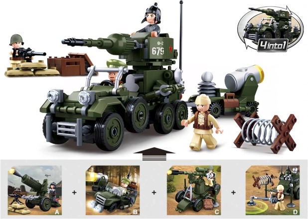 Mini-ensemble de véhicules de combat de la série WWII 4en1, dont l’assemblage permet de construire un grand modèle cohérent d’un tracteur d’artillerie. Les ensembles de construction innovants Sluban peuvent être combinés avec des ensembles similaires de nombreux autres fabricants renommés. Ils sont fabriqués en plastique ABS de haute qualité, sûr et résistant. Chaque coffret comprend une notice de montage et est emballé dans une boîte en carton richement imprimée. Principales caractéristiques : 88 pièces, 1 figurine, difficulté moyenne, en complétant la série il est possible de construire un grand modèle, figurines innovantes avec parties du corps rotatives et articulées, compatibles avec les ensembles d’autres fabricants