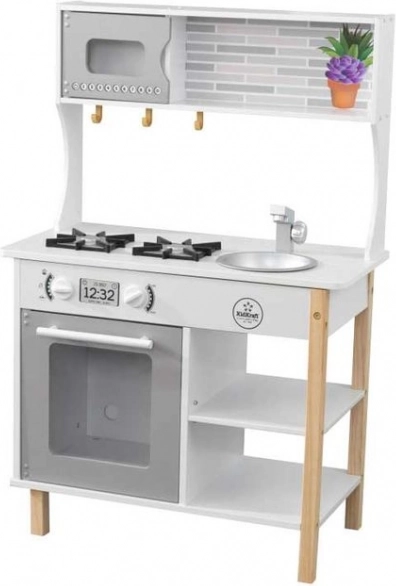 La cuisine en bois élégante KidKraft transforme la chambre d’enfant en petit bistrot. Elle propose des boutons rotatifs réalistes avec clic, des portes ouvrantes pour le four et le micro-ondes et 38 accessoires. Grâce à l’évier amovible pour un nettoyage facile, aux étagères et aux crochets, chaque chose a sa place. Convient dès 3 ans. Dimensions 59,9 × 34,29 × 90 cm.