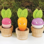 - 3 légumes adorables : carotte, radis, betterave – chacun dans un pot en bois