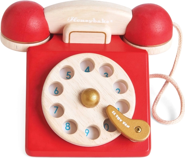Découvrez le charme du téléphone classique à échelle enfant. Ce téléphone rétro en bois de LE TOY VAN, collection Honeybake, séduit par sa teinte rouge soutenue, ses détails naturels et des éléments réalistes comme le cadran rotatif et la clochette dans le combiné. Le jouet est peint à la main avec des peintures écologiques et conçu pour durer.