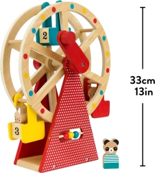 Les enfants peuvent facilement faire tourner la grande roue grâce à une manivelle robuste et observer le mouvement fluide des nacelles – un excellent exercice de coordination et de patience.